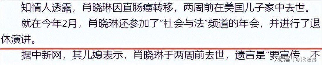 2017年6月28日,距离肖晓琳退休仅5个月,她在美国儿子家中悄然离世,终年55岁。